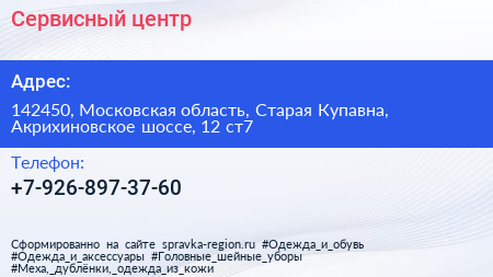 Сервисный центр по адресу 142450, Московская область, Старая Купавна, Акрихиновское шоссе, 12 ст7 в дальнейшем Организация, размещена в следующих категориях:
