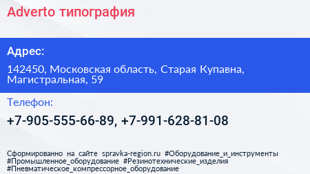 Adverto, типография по адресу 142450, Московская область, Старая Купавна, Магистральная, 59 в дальнейшем Организация, размещена в следующих категориях: