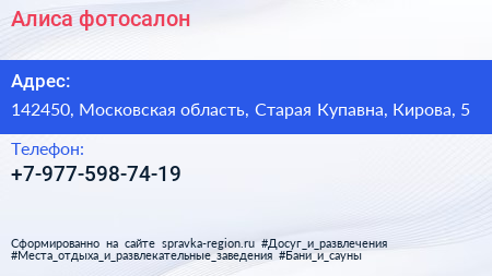 Алиса, фотосалон по адресу 142450, Московская область, Старая Купавна, Кирова, 5 в дальнейшем Организация, размещена в следующих категориях: