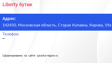 Liberty, бутик по адресу 142450, Московская область, Старая Купавна, Кирова, 19а в дальнейшем Организация, размещена в следующих категориях: