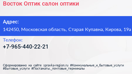 Восток Оптик, салон оптики по адресу 142450, Московская область, Старая Купавна, Кирова, 19а в дальнейшем Организация, размещена в следующих категориях: