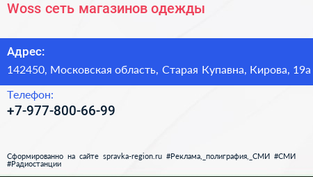 Woss, сеть магазинов одежды по адресу 142450, Московская область, Старая Купавна, Кирова, 19а в дальнейшем Организация, размещена в следующих категориях: