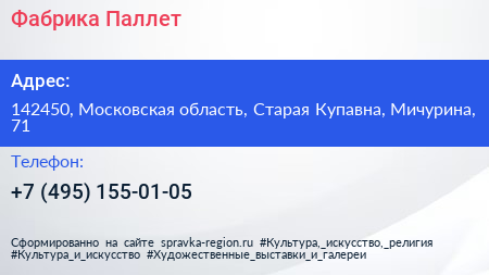 Фабрика Паллет по адресу 142450, Московская область, Старая Купавна, Мичурина, 71 в дальнейшем Организация, размещена в следующих категориях: