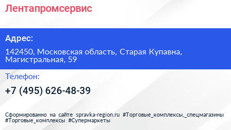 Лентапромсервис по адресу 142450, Московская область, Старая Купавна, Магистральная, 59 в дальнейшем Организация, размещена в следующих категориях: