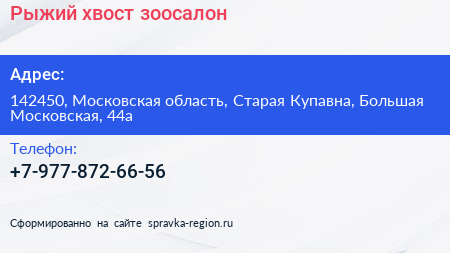 Рыжий хвост, зоосалон по адресу 142450, Московская область, Старая Купавна, Большая Московская, 44а в дальнейшем Организация, размещена в следующих категориях: