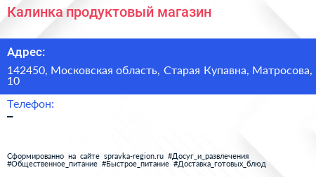 Калинка, продуктовый магазин по адресу 142450, Московская область, Старая Купавна, Матросова, 10 в дальнейшем Организация, размещена в следующих категориях: