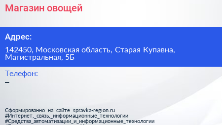 Магазин овощей по адресу 142450, Московская область, Старая Купавна, Магистральная, 5Б в дальнейшем Организация, размещена в следующих категориях: