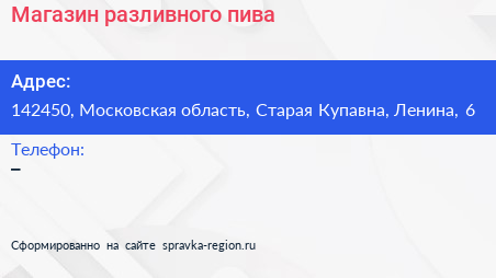 Магазин разливного пива по адресу 142450, Московская область, Старая Купавна, Ленина, 6 в дальнейшем Организация, размещена в следующих категориях: