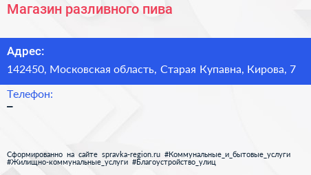 Магазин разливного пива по адресу 142450, Московская область, Старая Купавна, Кирова, 7 в дальнейшем Организация, размещена в следующих категориях: