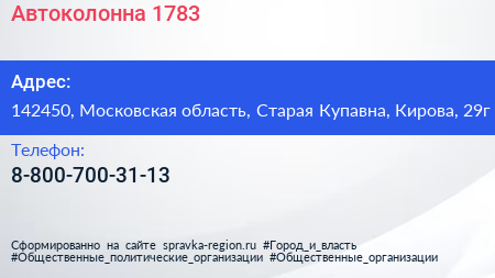 Автоколонна №1783 по адресу 142450, Московская область, Старая Купавна, Кирова, 29г в дальнейшем Организация, размещена в следующих категориях: