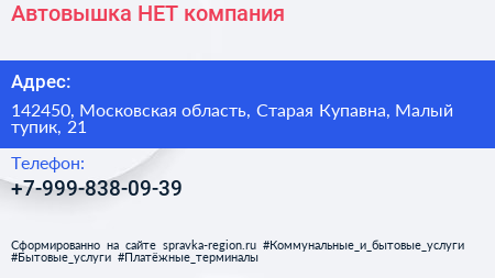 Автовышка.НЕТ, компания по адресу 142450, Московская область, Старая Купавна, Малый тупик, 21 в дальнейшем Организация, размещена в следующих категориях: