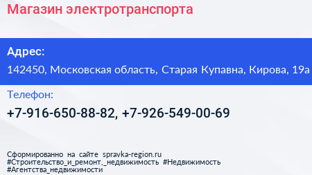 Магазин электротранспорта по адресу 142450, Московская область, Старая Купавна, Кирова, 19а в дальнейшем Организация, размещена в следующих категориях: