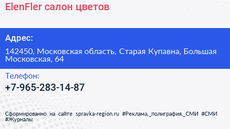 ElenFler, салон цветов по адресу 142450, Московская область, Старая Купавна, Большая Московская, 64 в дальнейшем Организация, размещена в следующих категориях: