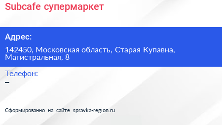 Subcafe, супермаркет по адресу 142450, Московская область, Старая Купавна, Магистральная, 8 в дальнейшем Организация, размещена в следующих категориях: