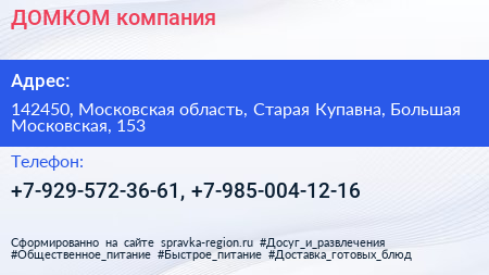ДОМКОМ, компания по адресу 142450, Московская область, Старая Купавна, Большая Московская, 153 в дальнейшем Организация, размещена в следующих категориях: