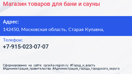 Магазин товаров для бани и сауны по адресу 142450, Московская область, Старая Купавна, в дальнейшем Организация, размещена в следующих категориях: