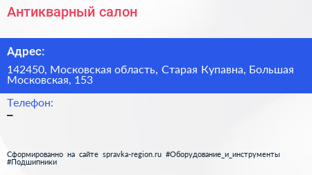 Антикварный салон по адресу 142450, Московская область, Старая Купавна, Большая Московская, 153 в дальнейшем Организация, размещена в следующих категориях:
