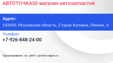 АВТОТОЧКА50, магазин автозапчастей по адресу 142450, Московская область, Старая Купавна, Ленина, 6 в дальнейшем Организация, размещена в следующих категориях: