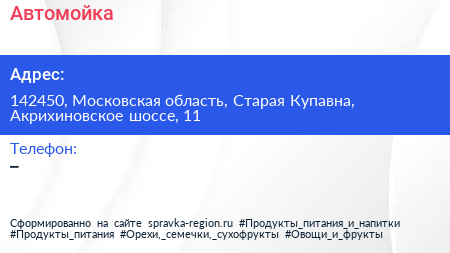 Автомойка по адресу 142450, Московская область, Старая Купавна, Акрихиновское шоссе, 11 в дальнейшем Организация, размещена в следующих категориях: