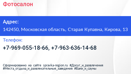 Фотосалон по адресу 142450, Московская область, Старая Купавна, Кирова, 13 в дальнейшем Организация, размещена в следующих категориях:
