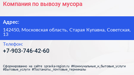 Компания по вывозу мусора по адресу 142450, Московская область, Старая Купавна, Советская, 13 в дальнейшем Организация, размещена в следующих категориях: