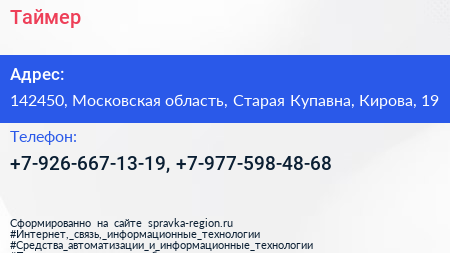 Таймер по адресу 142450, Московская область, Старая Купавна, Кирова, 19 в дальнейшем Организация, размещена в следующих категориях:
