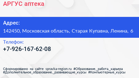 АРГУС, аптека по адресу 142450, Московская область, Старая Купавна, Ленина, 6 в дальнейшем Организация, размещена в следующих категориях: