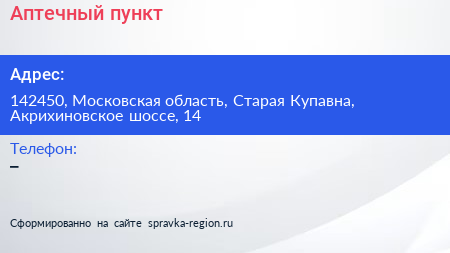 Аптечный пункт по адресу 142450, Московская область, Старая Купавна, Акрихиновское шоссе, 14 в дальнейшем Организация, размещена в следующих категориях: