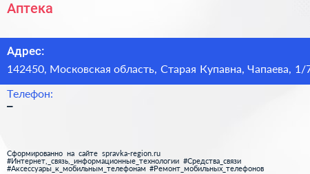 Аптека по адресу 142450, Московская область, Старая Купавна, Чапаева, 1/7 в дальнейшем Организация, размещена в следующих категориях: