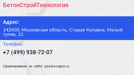 БетонСтройТехнология по адресу 142450, Московская область, Старая Купавна, Малый тупик, 21 в дальнейшем Организация, размещена в следующих категориях: