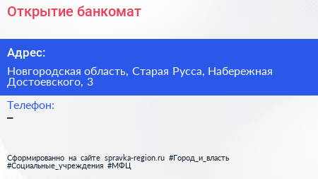 Открытие, банкомат по адресу Новгородская область, Старая Русса, Набережная Достоевского, 3 в дальнейшем Организация, размещена в следующих категориях: