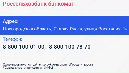 Россельхозбанк, банкомат по адресу Новгородская область, Старая Русса, улица Восстания, 1а в дальнейшем Организация, размещена в следующих категориях:
