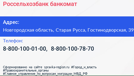 Россельхозбанк, банкомат по адресу Новгородская область, Старая Русса, Гостинодворская, 39 в дальнейшем Организация, размещена в следующих категориях:
