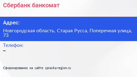 Сбербанк, банкомат по адресу Новгородская область, Старая Русса, Поперечная улица, 73 в дальнейшем Организация, размещена в следующих категориях: