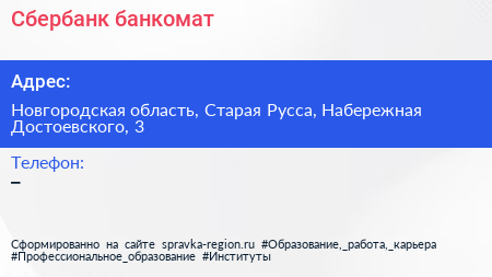 Сбербанк, банкомат по адресу Новгородская область, Старая Русса, Набережная Достоевского, 3 в дальнейшем Организация, размещена в следующих категориях: