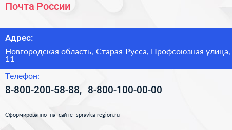 Почта России по адресу Новгородская область, Старая Русса, Профсоюзная улица, 11 в дальнейшем Организация, размещена в следующих категориях: