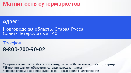 Магнит, сеть супермаркетов по адресу Новгородская область, Старая Русса, Санкт-Петербургская, 40 в дальнейшем Организация, размещена в следующих категориях: