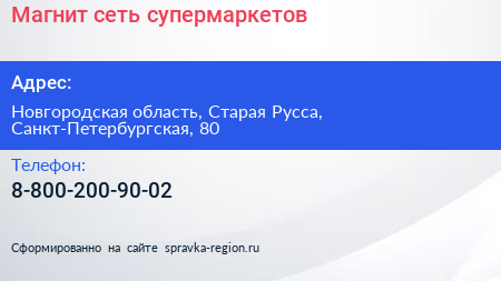 Магнит, сеть супермаркетов по адресу Новгородская область, Старая Русса, Санкт-Петербургская, 80 в дальнейшем Организация, размещена в следующих категориях: