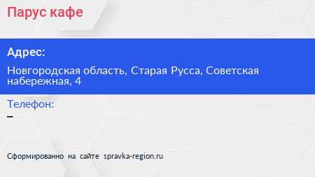 Парус, кафе по адресу Новгородская область, Старая Русса, Советская набережная, 4 в дальнейшем Организация, размещена в следующих категориях: