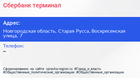 Сбербанк, терминал по адресу Новгородская область, Старая Русса, Воскресенская улица, 7 в дальнейшем Организация, размещена в следующих категориях:
