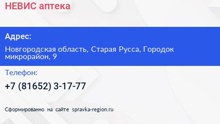 НЕВИС, аптека по адресу Новгородская область, Старая Русса, Городок микрорайон, 9 в дальнейшем Организация, размещена в следующих категориях: