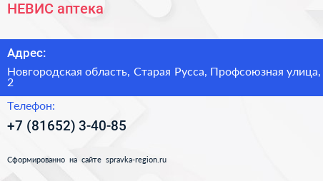 НЕВИС, аптека по адресу Новгородская область, Старая Русса, Профсоюзная улица, 2 в дальнейшем Организация, размещена в следующих категориях: