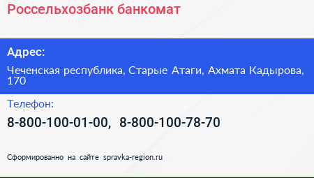 Россельхозбанк, банкомат по адресу Чеченская республика, Старые Атаги, Ахмата Кадырова, 170 в дальнейшем Организация, размещена в следующих категориях:
