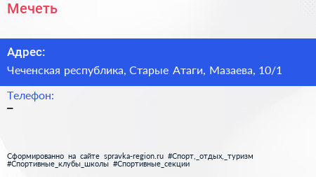 Мечеть по адресу Чеченская республика, Старые Атаги, Мазаева, 10/1 в дальнейшем Организация, размещена в следующих категориях: