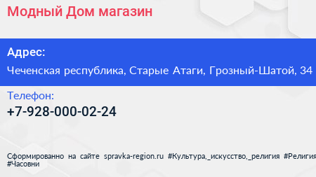 Модный Дом, магазин по адресу Чеченская республика, Старые Атаги, Грозный-Шатой, 34 в дальнейшем Организация, размещена в следующих категориях: