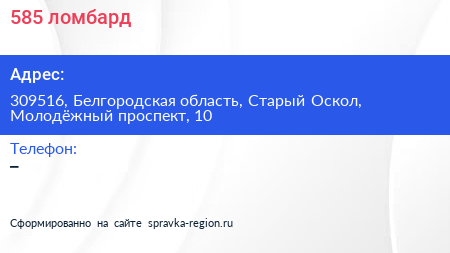585, ломбард по адресу 309516, Белгородская область, Старый Оскол, Молодёжный проспект, 10 в дальнейшем Организация, размещена в следующих категориях: