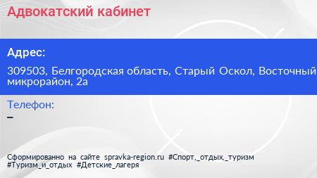 Адвокатский кабинет по адресу 309503, Белгородская область, Старый Оскол, Восточный микрорайон, 2а в дальнейшем Организация, размещена в следующих категориях: