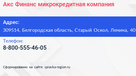 Акс Финанс, микрокредитная компания по адресу 309514, Белгородская область, Старый Оскол, Ленина, 40 в дальнейшем Организация, размещена в следующих категориях: