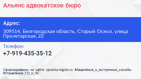 Альянс, адвокатское бюро по адресу 309514, Белгородская область, Старый Оскол, улица Пролетарская, 22 в дальнейшем Организация, размещена в следующих категориях: