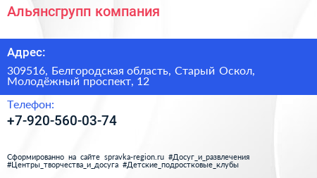 Альянсгрупп, компания по адресу 309516, Белгородская область, Старый Оскол, Молодёжный проспект, 12 в дальнейшем Организация, размещена в следующих категориях:
